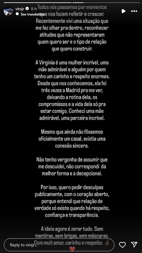 وینیسیوس افزود: «شرمنده نیستم که بگویم اشتباه کردم، به بهترین شکل پاسخ ندادم و او را ناامید کردم. به همین دلیل با قلبی باز، بهصورت علنی عذرخواهی میکنم، چون فهمیدم رابطه واقعی فقط با احترام، اعتماد و شفافیت ممکن است. حالا هدفم این است که همهچیز را از نو شروع کنم. بدون دروغ، بدون دعوا، بدون ماسک. با عشق، محبت و احترام زیاد.»