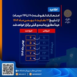 معاون آموزشی و تحصیلات تکمیلی دانشگاه پیام نورگفت: امتحانات هفته پیش رو در دانشگاه پیام نور طبق برنامه از قبل تعیین شده؛ و آزمون های لغو شده در روزهای شنبه ۴ تا چهارشنبه ۸ بهمن ماه برگزار خواهد شد.