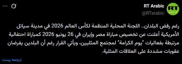 رسانه RT خبر داد: مسئولان برگزاری جام جهانی ۲۰۲۶ بدون توجه به درخواست فدراسیونهای فوتبال ایران و مصر مبنی بر عدم طرح موضوعات مرتبط با «گرایشهای جنسی خاص»، تصمیم خود درباره نحوه برگزاری دیدار دو تیم را تغییر ندادند.