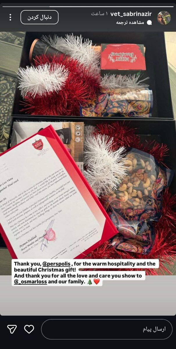همسر کادر فنی قرمزها هم حسابی از این هدایا ذوق زده شد و با انتشار یک استوری از تیم پرسپولیس تشکر کرد و نوشت: «ممنون پرسپولیس، برای مهمان نوازی داغ و هدیه زیبای کریسمس و از شما به خاطر تمام محبت و توجه هایی که به اوسمار و خانواده مان نشان می دهید متشکرم.»