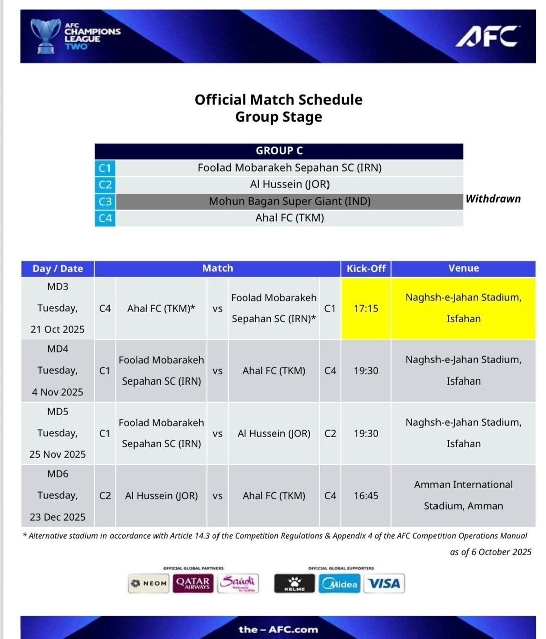 به گزارش خبرگزاری خبرآنلاین؛ تیم فوتبال سپاهان ایران طبق برنامه کنفدراسیون فوتبال آسیا (AFC) در چارچوب دور سوم از مرحله گروهی لیگ قهرمانان آسیا 2، در روز 29 مهر میهمان تیم آخال ترکمنستان خواهد بود.
