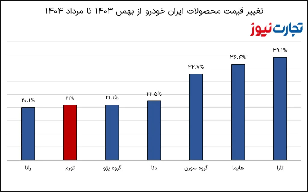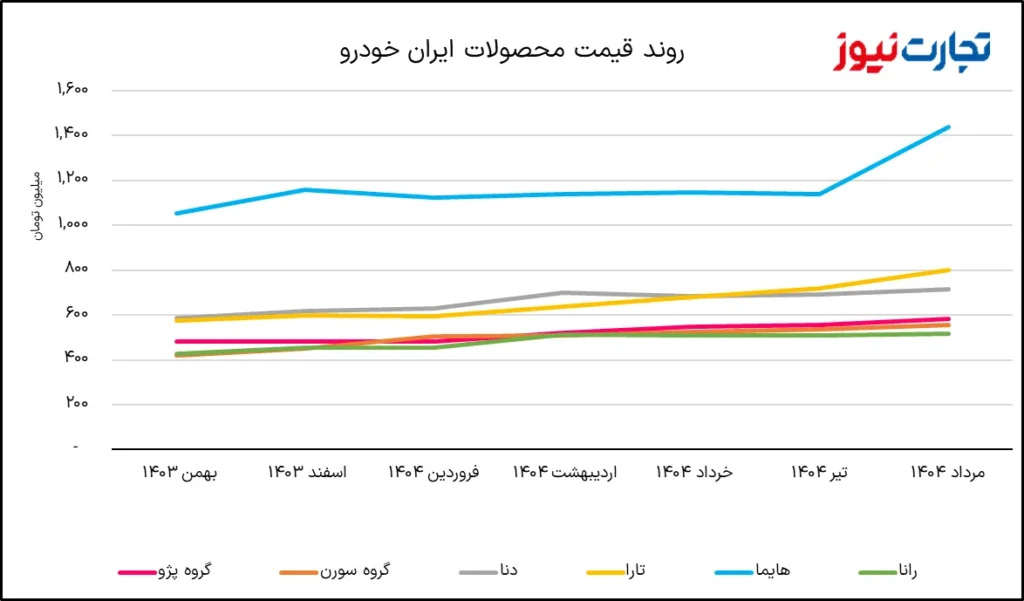 بر اساس دادههای رسمی، قیمت گروه پژو در فاصله بهمن تا مرداد رشد ۲۱.۱ درصدی داشته که تقریبا همسطح با تورم عمومی است. با این حال سایر محصولات ایران خودرو فاصلهای معنادار با نرخ تورم دارند. به طور مثال قیمت گروه سورن با ۳۲.۷ درصد افزایش، بیش از یکسوم رشد کرده است. دنا نیز با رشد ۲۲.۵ درصدی اندکی بالاتر از تورم حرکت کرده و تارا با جهش ۳۹.۱ درصدی، رکورددار افزایش قیمت بوده است.