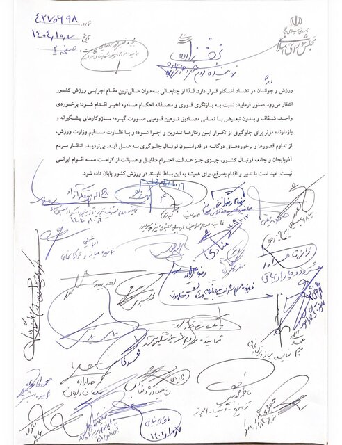 به گزارش ایسنا به نقل از دفتر این نماینده در روز یکشنبه هفتم دی، امضاکنندگان این نامه ضمن محکومیت قاطع هرگونه توهین و نفرتپراکنی قومیتی در ورزشگاهها، تأکید کرده اند که مطالبه سرنوشتساز نمایندگان، برخورد واحد، واضح و بدون تبعیض با تمامی مصادیق مشابه و اعمال نظارت مستقیم وزارت ورزش بر نمایش فدراسیون فوتبال است و بیتوجهی به این مسئله، انسجام اجتماعی و وحدت ملی را با تهدید مواجه میکند و انتظار میرود وزارت ورزش با تصمیمات قاطع و عادلانه، به این حاشیههای مخرب در فوتبال کشور خاتمه دهد.