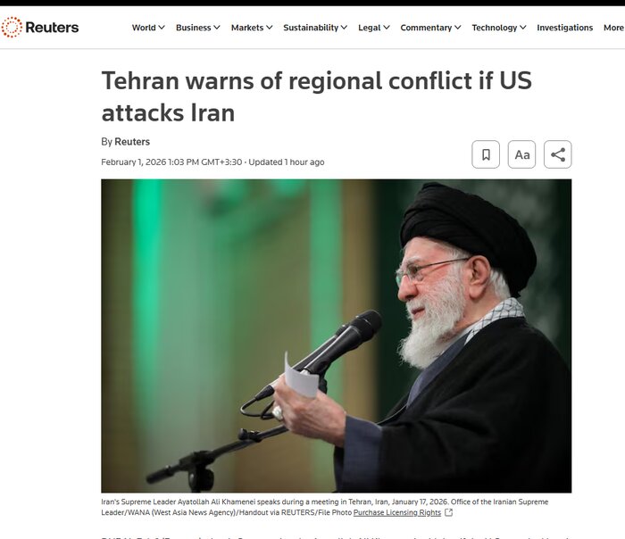 این خبرگزاری با بازتاب سخنان رهبر معظم انقلاب نوشت: «رهبر ایران اعلام کرد که اگر آمریکا به ایران حمله کند، این امر به درگیری منطقهای تبدیل خواهد شد».
