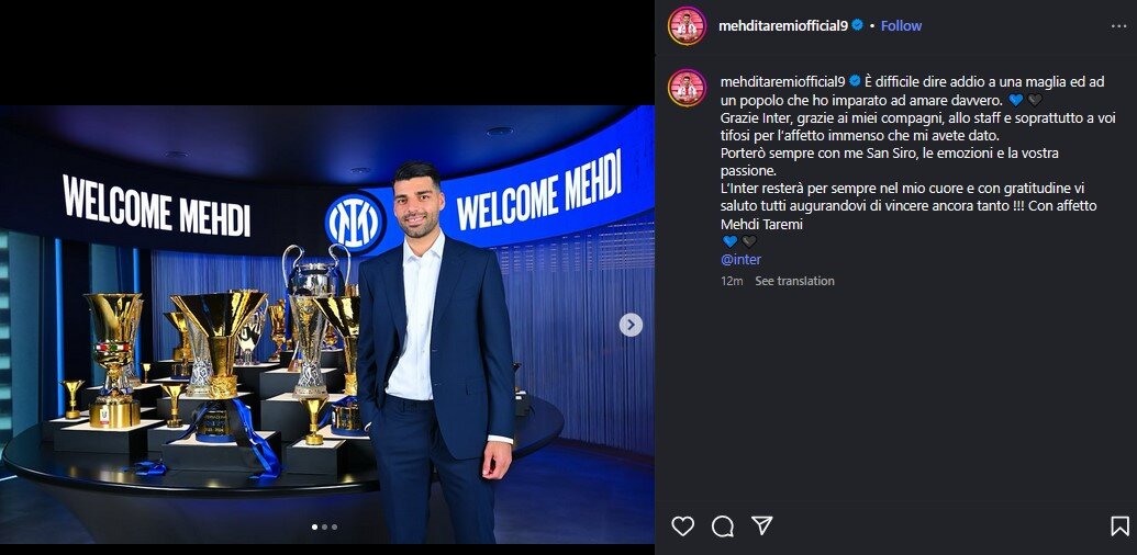 طارمی در متن خود نوشت: «خداحافظی از پیراهن و مردمی که واقعاً یاد گرفتم عاشقشان باشم، سخت است. ممنون اینتر، ممنون از هم‌تیمی‌هایم، کادر فنی و به‌ویژه شما هواداران برای عشق و محبتی که بی‌نهایت به من دادید.