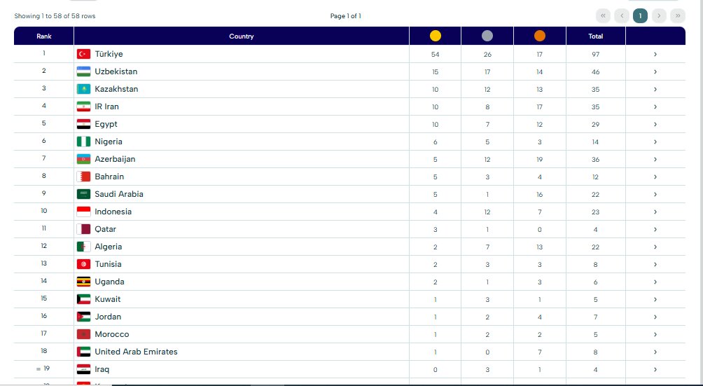 در جدول توزیع مدال های بازی های کشورهای اسلامی و تا پیش از آغاز رقابت های روز هفتم، ترکیه کماکان صدرنشین است. این صدرنشینی به واسطه ۹۷ مدال شامل ۵۴ طلا، ۲۶ نقره و ۱۷ برنز کسب شده است. ازبکستان و قزاقستان نیز به ترتیب با ۴۶ و ۳۵ مدال در رده های دوم و سوم ایستاده اند.