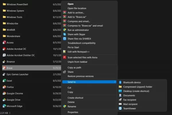 - حال در پنجره بازشده، روی برنامه مورد نظر راستکلیک کرده و از بخش Send to، گزینه Desktop (create shortcut) را انتخاب کنید. توجه داشته باشید که این گزینه را نمیبینید، لازم است روی Show more options کلیک کنید تا آپشنهای بیشتری نمایش داده شود.