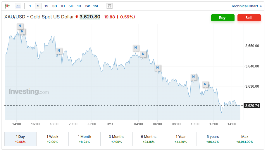 قیمت طلای جهانی که در ابتدای روز در نرخ 3633 دلار قرار داشت؛ در ابتدا با کاهش تا سطح 3625 دلار پایین آمد و با تغییر روند صعودی شد و تا سطح 3636 دلار بالا رفت . قیمت طلا بار دیگر با روند نزولی رو به کف کانال 3600 دلار حرکت کرد و تا سطح 3614 دلار کاهش یافت و در لحظه نگارش این گزارش در نرخ 3620 دلار در معامله بود.